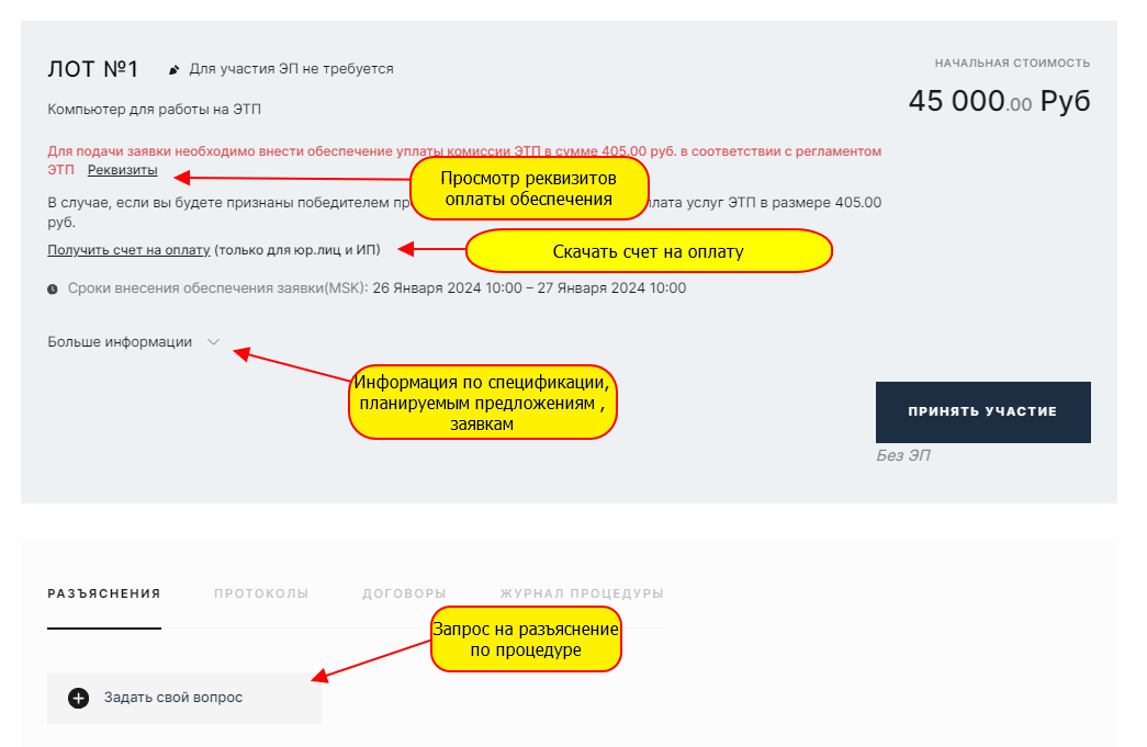 В открывшемся окне отобразятся существенные условия закупки, лоты закупки, документы для ознакомления по закупке, реквизиты оплаты, возможность запроса разъяснений по процедуре.