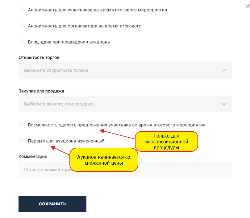 Для размещения процедуры необходимо определится с потребностью: - создания нового комплекта документов запрашиваемого у претендентов на участие в процедуре, - создания нового шаблона процедуры, - создание комиссии для принятия решения по каждому этапу процедуры закупки/продажи. 1.Комплект документов для подачи предложений участниками Для создания нового комплекта документов необходимо: Добавить новый комплект документов можно копированием существующего комплекта документов или добавлением нового комплекта: Добавление комплекта документов. Нажать на кнопку «Добавить комплект документов». В открывшейся форме «Редактировать комплект» необходимо указать код и наименование , нажать «Сохранить». В добавленной строке кнопкой разверните содержимое комплекта : По каждому выбранному документу можно редактировать дополнительные детали, а именно - предоставления документа участником, являющимся: - Юридическим лицом; - Физическим лицом; - Индивидуальным предпринимателем; - Резидентом; - Не резидентом. В случае отсутствия необходимого типа документов в перечне документов. Можно направить администратору запрос на добавление. 2. Создание шаблона процедуры . Для создания нового шаблона процедуры необходимо в меню «Организатору» выбрать раздел «Мои шаблоны процедур». В открывшемся окне нажать «Добавить новый шаблон» . В открывшемся окне необходимо заполнить все поля. По заполнению некоторых полей ниже приведены комментарии. После завершения заполнения шаблона необходимо нажать кнопку «Сохранить». 3. Добавление комиссии. Для формирования на ЭТП комиссии, принимающей решение по окончании этапов процедур закупки/ продажи необходимо : 1). в пункте меню выбрать «Организатору», затем «Комиссии». В открывшемся окне выбрать «Добавить комиссию». В открывшейся форме заполнить обязательные поля. После заполнения полей нажать кнопку «Сохранить». 2). В добавленной строке кнопкой разверните содержимое комиссии , нажмите кнопку «Добавить члена комиссии» : 3). В открывшейся форме «Редактирование состава комиссии» заполнить все обязательные поля. После заполнения нажать на кнопку «Создать». Количество членов комиссии не ограничено.