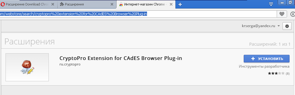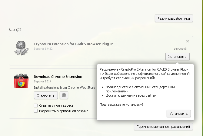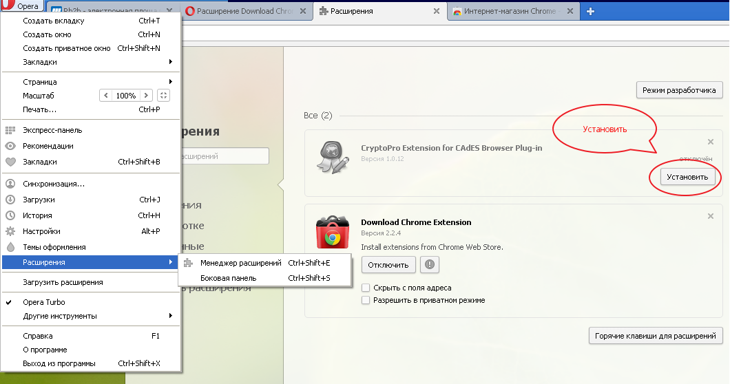 2.1. Требования к техническому обеспечению рабочего места пользователя ЭТП • ПК с объёмом ОЗУ не менее 512 Мбайт; • Интернет соединение на скорости не менее 128Кбит/с; • Разрешение экрана не ниже 1024х768; 2.2. Требования к программному обеспечению • Операционная система Windows XP/Vista/Windows 7/Windows10/Windows11; • Интернет обозреватель Google Chrome,Firefox, Opera, Microsoft Edge(Chromium); • Средства редактирования документов (MS Office, Open Office, WordPad) • Средства сжатия документов (WinRAR, 7Zip) • КриптоПРО CSP версии 3.0 и выше; • КриптоПРО ЭП Browser plug-in; 2.3. Установка необходимого ПО: 2.3.1 Настройка браузеров Google Chrome, Yandex , Microsoft Edge (Chromium) . Устанавливаем CryptoPro Extension for CAdES Browser Plug-in : Открываем в Google Chrome ссылку : CryptoPro Extension for CAdES Browser Plug-in Заходим в Меню-Расширения , проверяем что установленное расширение включено : Можно использовать ЭЦП , возможно нужно будет перезапустить браузер. 2.3.2. Настройка браузера Opera. Для работы ЭЦП в браузере Opera необходимо установить расширения : Download Chrome Extension. Открываем в Opera ссылку : Download Chrome Extension. Нажимаем Добавить в Opera , ждём окончания установки . CryptoPro Extension for CAdES Browser Plug-in Открываем в Opera ссылку : CryptoPro Extension for CAdES Browser Plug-in Нажимаем Установить Переходим в Расширения - Менеджер расширений : напротив расширения CryptoPro нажимаем кнопку Установить Подтверждаем установку расширения : жмем Установить Заходим в Меню- Управление расширениями , проверяем что установленное расширение включено: Перезапускаем браузер , можно использовать ЭЦП в Opera... 2.3.3. Для установки КриптоПро CSP: • Запустите файл установки КриптоПро CSP, • Следуйте инструкциям на экране, • Перезагрузите компьютер. 2.3.4. Для установки сертификатов ЭП: 1) Убедитесь что носитель с закрытым ключом (дискета, USB-накопитель, rutoken) подключены к компьютеру. 2) Для установки сертификатов нажмите кнопку «Пуск», расположенную в левом нижнем углу экрана, после чего в появившемся меню выберите пункт «Настройка», а затем – «Панель управления». 3) В списке программ выберите и запустите «КриптоПро CSP». 4) При открытии программы становится активной вкладка «Общие». Удостоверьтесь, что установлена версия программы 3.6 или выше (сведения о версии представлены в правом верхнем углу окна). 5) Перейдите во вкладку «Сервис», щелкнув по ее заголовку, и нажмите кнопку «Посмотреть сертификаты в контейнере». На экране появится окно сертификатов в контейнере Закрытого ключа: 6) Нажмите кнопку «Обзор» и выберите нужный ключ. После этого в списке должен появиться Ваш сертификат. Нажмите кнопку «ОК»; 7) В появившемся окне выберите пункт «Свойства». На экране отобразятся данные о сертификате. Если сертификат установлен правильно, то во вкладке «Общие» появятся сведения, сообщающие о сроке действия сертификата, адресате (кому выдан), центре выдачи (кем выдан), а также назначении сертификата; 8) Если установленный сертификат проверить не удалось (в этом случае на экране отображается соответствующая надпись), произведите дополнительные действия: • Перейдите на сайт www.aetp.ru; • Выберите пункт «ЭП», а в нем – «Удостоверяющие центры» и найдите свой Удостоверяющий Центр (см. «кем выдан» на 6-м шаге); • Скачайте корневой сертификат; • Установите данный корневой сертификат. Для этого во вкладке «Общие» нажмите кнопку «Установить сертификат». На экране появится окно мастера импорта сертификатов, нажмите в нем кнопку «Далее»; • Выберите пункт «Поместить все сертификат